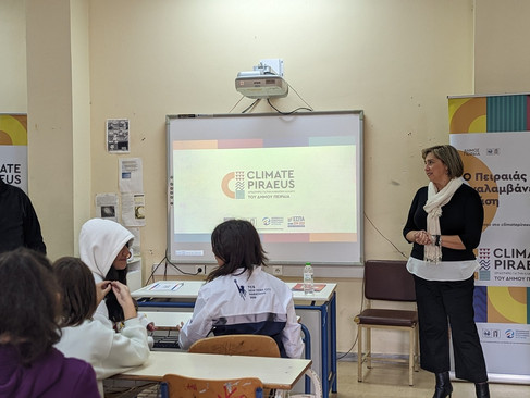 Η Κλιματική αλλαγή αποτελεί ένα αδιαμφισβήτητο φαινόμενο που μας αφορά όλους. Ο «Πειραιάς αναλαμβάνει δράση»! Στο πλαίσιο του προγράμματος «Πιλοτικός Μηχανισμός Ενημέρωσης, Πρόληψης, Διαχείρισης και Ευαισθητοποίησης, για τους κινδύνους που απορρέουν από την κλιματική αλλαγή στο Αστικό περιβάλλον του Πειραιά» με κωδικό ΟΠΣ (MIS) 5047883, η επιστημονική ομάδα του εργαστηρίου για την κλιματική αλλαγή, πραγματοποίησε την δεύτερη επίσκεψη της σε ένα από τα γυμνάσια του Δήμου στα Μανιάτικα. Συγκεκριμένα, την Τρίτη 29 Νοεμβρίου ολοκληρώθηκε το εργαστήριο ενημέρωσης για την Πρόληψη, Διαχείριση και ευαισθητοποίηση των μαθητών του Δήμου μας για τους κλιματικούς κινδύνους στο Αστικό περιβάλλον του Πειραιά. Στη δράση αυτή συμμετείχαν μαθητές του 8ου Γυμνασίου Πειραιά. Οι μαθητές παρακολούθησαν ένα spot και μια παρουσίαση σχετικά με τα αίτια και τις επιπτώσεις της κλιματικής αλλαγής. Στο τέλος συμμετείχαν σε ένα διαδραστικό εργαστήριο ρητορικής που είχε ως στόχο να εγείρει τη φαντασία τους προκειμένου να ανακαλύψουν πρακτικές για μία πιο πράσινη και πιο φιλική προς το περιβάλλον πόλη και καθημερινότητα. Τα παιδιά μας είναι το μέλλον και οφείλουμε να τους καταστήσουμε αρωγούς των προσπαθειών για την προστασία του περιβάλλοντος.